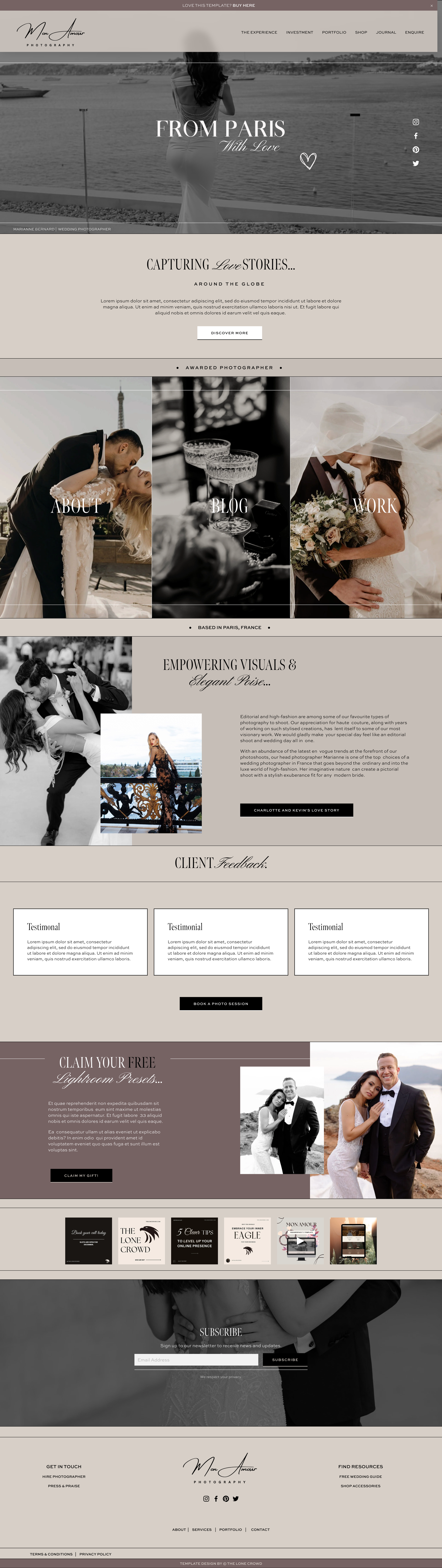MON AMOUR is a romantic, elegant website template designed for photographers, wedding planners, artists, consultants and other service-based entrepreneurs. Its refined layout makes it easy to showcase your work and present your brand beautifully. Purchase the template today and get ready to fall in love with Mon Amour!